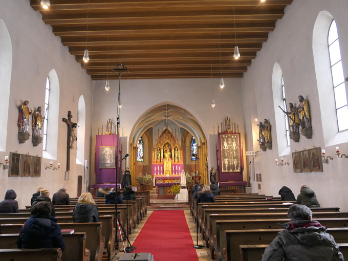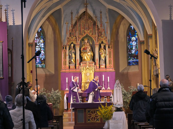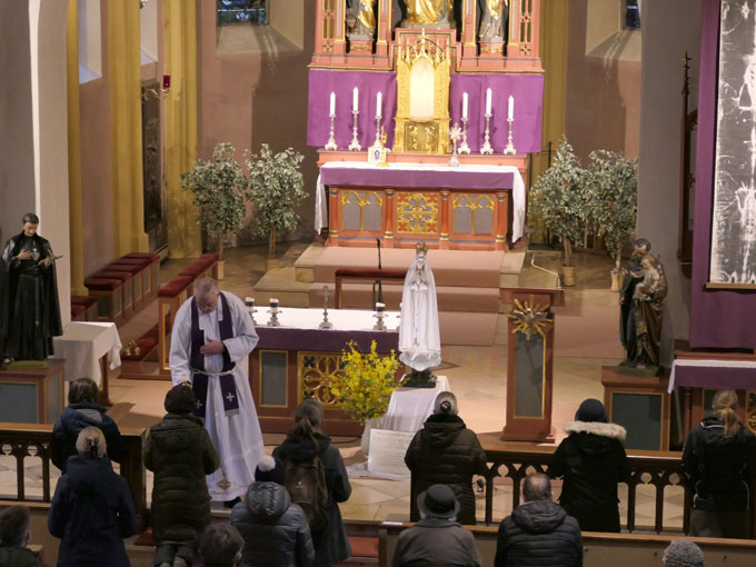 Schon vor dem Eintreffen der Pilgermadonna war eine Gruppe von Gläubigen versammelt, die den Rosenkranz beteten. Um 18.00 Uhr begann das offizielle Programm des Herz-Jesu-Freitags mit der Feier der hl. Messe. Hinterher wurde den Betern von Rektor P. Klaus Holzer der Einzelsegen mit den Reliquien der hl. Seherkinder von Fatima, Francisco und Jacinta, erteilt. Anschließend verweilten die Gläubigen bei Jesus im Allerheiligsten Sakrament.