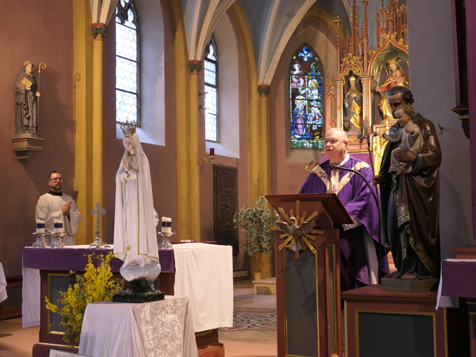 P. Klaus Holzer sprach in seiner Predigt vom dreifachen Aufstand gegen Gott in den Jahren 1517, 1717 und 1917: vom Aufstand gegen die Kirche Jesu, vom Aufstand gegen die Menschwerdung Jesu und seine Gottheit, vom Aufstand gegen die Existenz Gottes überhaupt. Diese drei Punkte der Geschichte hatten blutige Revolutionen und furchtbare Kriege und Nöte im Gefolge. Aber in jeder dieser Epochen hat Gott in seinem Erbarmen den Menschen Heilmittel zukommen lassen: die Heiligen, insbesondere heilige Bischöfe; das Heiligste Herz Jesu, das Unbefleckte Herz Mariens. Das Heilmittel, das er uns für diese letzten Zeiten gibt, sind die beiden vereinten Herzen Jesu und Mariens.