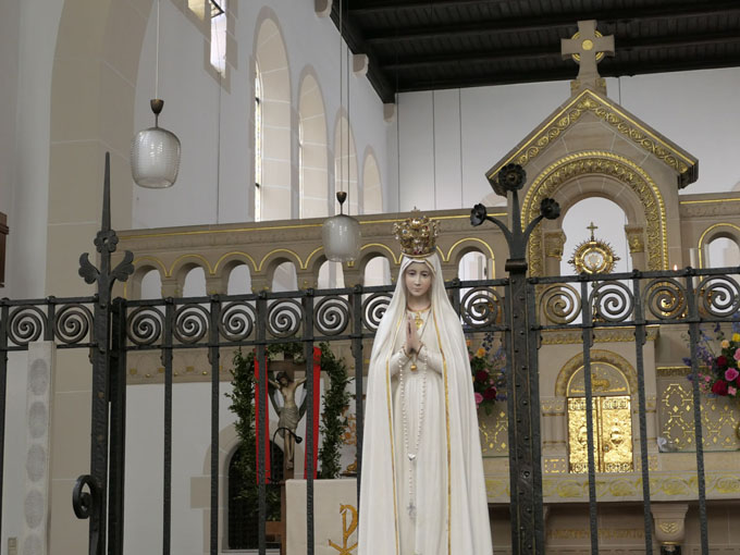 Da das Kloster Bethlehem sein Patrozinium am Hochfest des heiligsten Herzens Jesu feiert, wird auch jeder Herz-Jesu-Freitag besonders feierlich begangen. Zwei Tage vor dem Pfingstfest waren wir – in Gegenwart der Fatima-Pilgermadonna - „wie die Apostel mit der Muttergottes im Abendmahlssaal versammelt“, so der Zelebrant der hl. Messe, Pfr. Maus. „Die Menschen brauchen nichts so nötig wie die Eingießung des Heiligen Geistes und seine Gaben.“ In seiner Predigt bezog er sich auf die dreimalige Frage des Auferstandenen an Petrus: Liebst du mich? Petrus kann Jesus nur lieben wie einen Freund. Mehr geht nicht. Er möchte ihn tiefer lieben, lieben bis zur Ganzhingabe. Aber er weiß ja durch seinen dreimaligen Verrat, dass seine Versprechen brüchig sind. Er kann sie nicht halten. Jesus weiß das. Deswegen nimmt er auch das kleine Ja des Petrus an. Jesus selber wird Petrus zur Ganzhingabe befähigen.