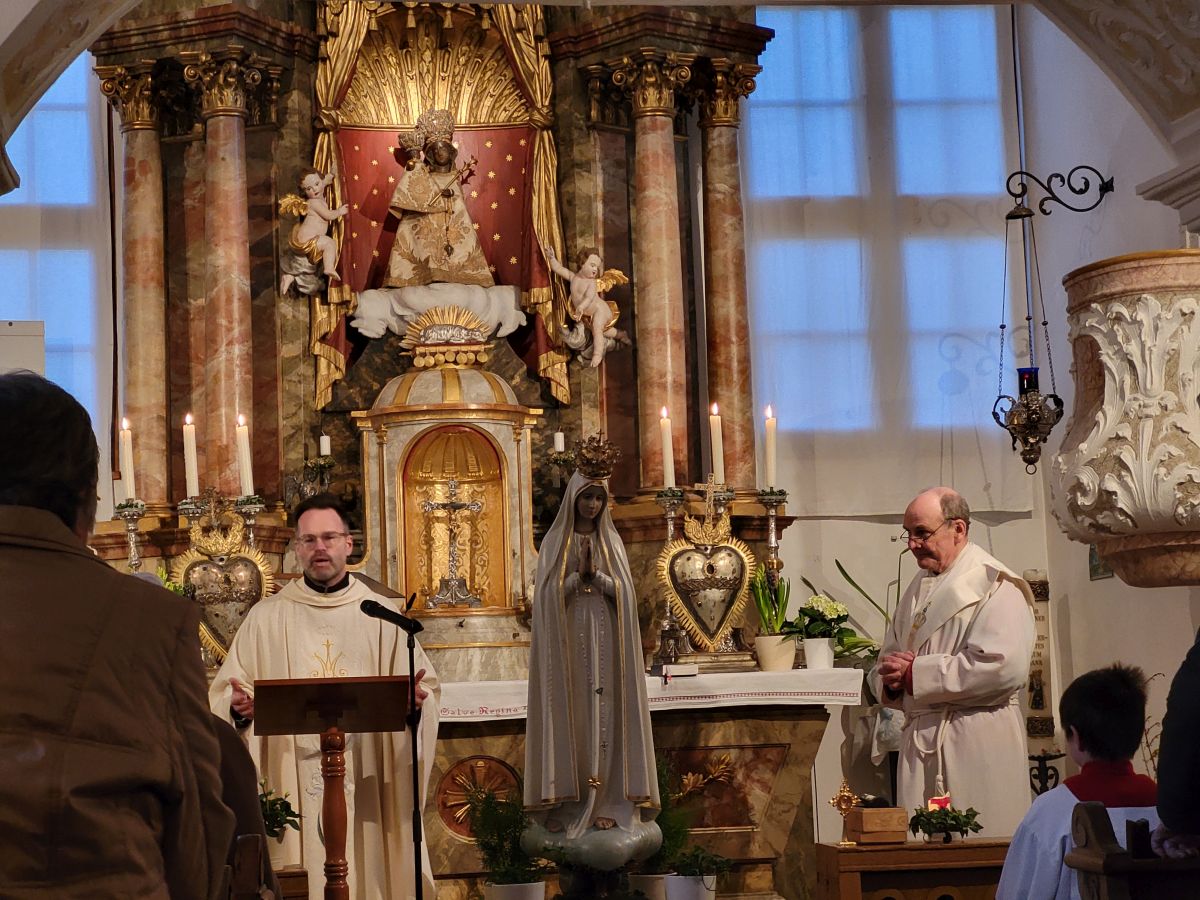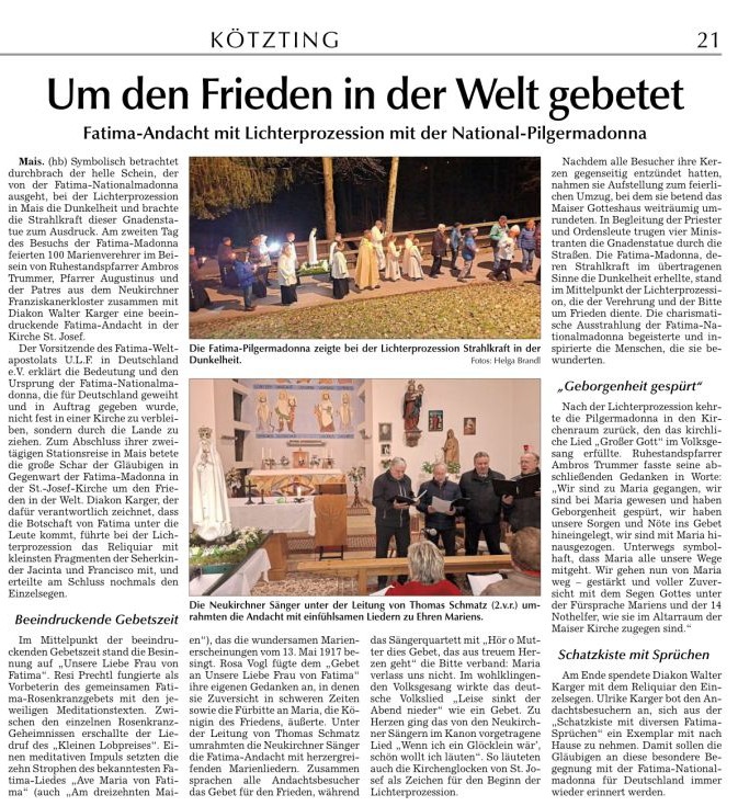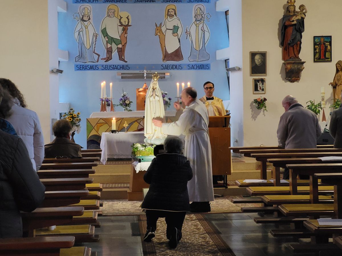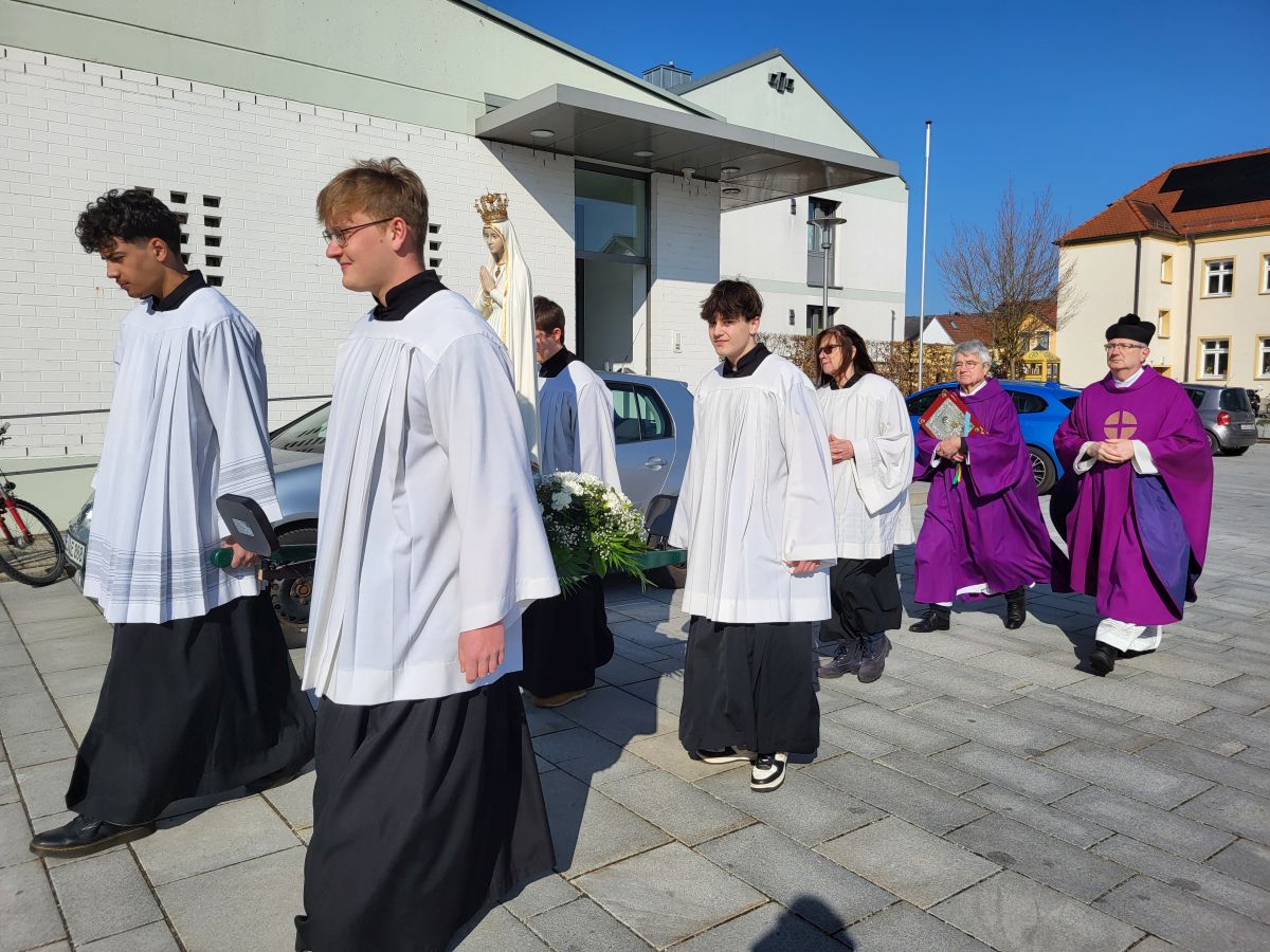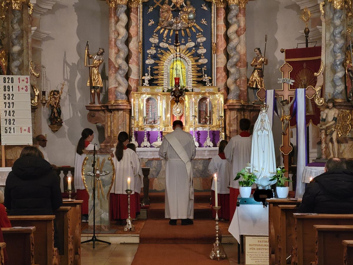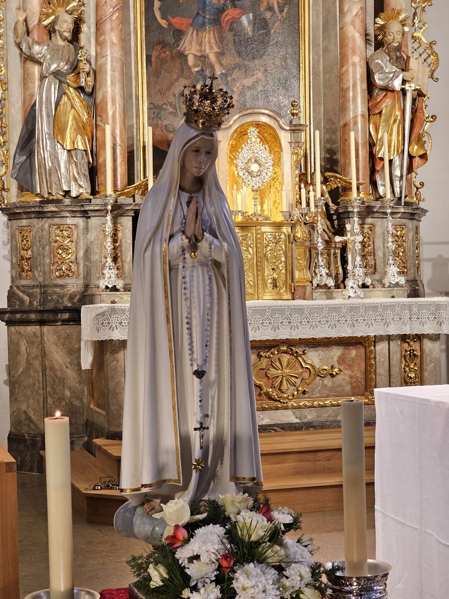 Mais. Symbolisch betrachtet durchbrach der helle Schein, der von der Fatima-Nationalmadonna ausgeht, bei der Lichterprozession in Mais die Dunkelheit und brachte die Strahlkraft dieser Gnadenstatue zum Ausdruck. Am zweiten Tag des Besuchs der Fatima-Madonna feierten 100 Marienverehrer im Beisein von Ruhestandspfarrer Ambros Trummer, Pfarrer Augustinus und der Patres aus dem Neukirchner Franziskanerkloster zusammen mit Diakon Walter Karger eine beeindruckende Fatima-Andacht in der Kirche St. Josef. Der Vorsitzende des Fatima-Weltapostolats U.L.F. in Deutschland e.V. erklärt die Bedeutung und den Ursprung der Fatima-Nationalmadonna, die für Deutschland geweiht und in Auftrag gegeben wurde, nicht fest in einer Kirche zu verbleiben, sondern durch die Lande zu ziehen. Zum Abschluss ihrer zweitägigen Stationsreise in Mais betete die große Schar der Gläubigen in Gegenwart der Fatima-Madonna in der St.-Josef-Kirche um den Frieden in der Welt. Diakon Karger, der dafür verantwortlich zeichnet, dass die Botschaft von Fatima unter die Leute kommt, führte bei der Lichterprozession das Reliquiar mit kleinsten Fragmenten der Seherkinder Jacinta und Francisco mit, und erteilte am Schluss nochmals den Einzelsegen. Im Mittelpunkt der beeindruckenden Gebetszeit stand die Besinnung auf „Unsere Liebe Frau von Fatima“. Resi Prechtl fungierte als Vorbeterin des gemeinsamen Fatima-Rosenkranzgebets mit den jeweiligen Meditationstexten „… Jesus, bei dessen Geburt Engel den Frieden verkündeten“ , „… der unsere Schritte auf den Weg des Friedens lenkt“, „… der seliggepriesen hat, die Frieden stiften“, „… der seine Jünger gesandt hat, den Frieden zu bringen“ und „…der uns seinen Frieden hinterlassen hat“. Zwischen den einzelnen Rosenkranz-Geheimnissen erschallte der Liedruf des „Kleinen Lobpreises“. Einen meditativen Impuls setzten die zehn Strophen des bekanntesten Fatima-Liedes „Ave Maria von Fatima“ (auch „Am dreizehnten Maien“), das die wundersamen Marienerscheinungen vom 13. Mai 1917 besingt. Der Liedtext beschreibt die Erscheinung der Jungfrau Maria vor den drei Hirtenkindern im Tal von Cova da Iria, mahnt zur Umkehr, zum Rosenkranzgebet und zur Verehrung Mariens mit dem melodischen Refrain: Ave, Ave, Ave Maria. Rosa Vogl fügte dem „Gebet an Unsere Liebe Frau von Fatima“ ihre eigenen Gedanken an, in denen sie Zuversicht in schweren Zeiten sowie die Fürbitte an Maria, die Königin des Friedens, äußerte. Unter der Leitung von Thomas Schmatz umrahmten die Neukirchner Sänger die Fatima-Andacht mit herzergreifenden Marienliedern, und verknüpften die Verehrung der Gottesmutter mit dem Lied „Da knie ich Maria vor deinem Bild“. Zusammen sprachen alle Andachtsbesucher das Gebet für den Frieden, während das Sängerquartett mit „Hör o Mutter dies Gebet, das aus treuem Herzen geht“ die Bitte verband: Maria verlass uns nicht! Im wohlklingenden Volksgesang wirkte das deutsche Volkslied „Leise sinkt der Abend nieder“ wie ein Gebet. Zu Herzen ging das von den Neukirchner Sängern im Kanon vorgetragene Lied „Wenn ich ein Glöcklein wär‘, schön wollt ich läuten“. So läuteten auch die Kirchenglocken von St. Josef als Zeichen für den Beginn der Lichterprozession. Nachdem alle Besucher ihre Kerzen gegenseitig entzündet hatten, nahmen sie Aufstellung zum feierlichen Umzug, bei dem sie betend das Maiser Gotteshaus weiträumig umrundeten. In Begleitung der Priester und Ordensleute trugen vier Ministranten die Gnadenstatue durch die Straßen. Die Fatima-Madonna, deren Strahlkraft im übertragenen Sinne die Dunkelheit erhellte, stand im Mittelpunkt der Lichterprozession, die der Verehrung und der Bitte um Frieden diente. Die charismatische Ausstrahlung der Fatima-Nationalmadonna begeisterte und inspirierte die Menschen, die sie bewunderten. Diese Statue zeichnet sich durch eine Kombination aus künstlerischer Ausdruckskraft und symbolischer Tiefe aus, die über eine rein handwerkliche Darstellung hinausgeht. Sie umgibt eine fesselnde Aura im positiven Sinn, weshalb die Menschen ihr folgen – so wie dieser Tage. Nach der Lichterprozession kehrte die Pilgermadonna in den Kirchenraum zurück, den das kirchliche Lied „Großer Gott“ im Volksgesang erfüllte. Ruhestandspfarrer Ambros Trummer dankte im Namen von Pfarrer Augustinus allen Organisatoren und Besuchern. Er fasste seine abschließenden Gedanken in Worte: Wir sind zu Maria gegangen, wir sind bei Maria gewesen und haben Geborgenheit gespürt, wir haben unsere Sorgen und Nöte ins Gebet hineingelegt, wir sind mit Maria hinausgezogen. Unterwegs symbolhaft, dass Maria alle unsere Wege mitgeht. Wir gehen nun von Maria weg – gestärkt und voller Zuversicht mit dem Segen Gottes unter der Fürsprache Mariens und der 14 Nothelfer, wie sie im Altarraum der Maiser Kirche zugegen sind. Am Ende spendete Diakon Walter Karger mit dem Reliquiar den Einzelsegen: „Auf die Fürsprache der Heiligen Seherkinder segne dich der allmächtige Gott…“. Ulrike Karger bot den Andachtsbesuchern an, sich aus der „Schatzkiste mit diversen Fatima-Sprüchen“ ein Exemplar mit nach Hause zu nehmen. Damit sollen die Gläubigen an diese besondere Begegnung mit der Fatima-Nationalmadonna für Deutschland immer wieder erinnert werden.