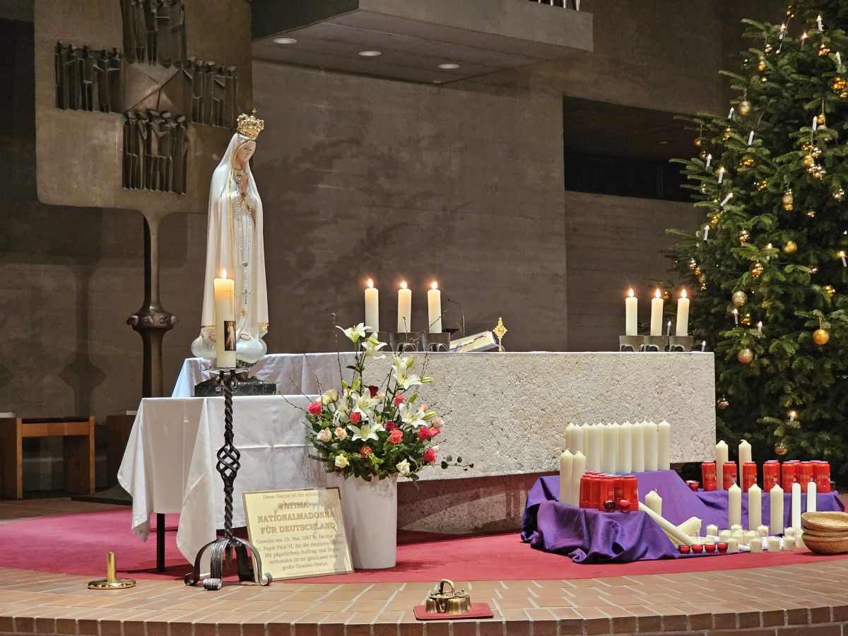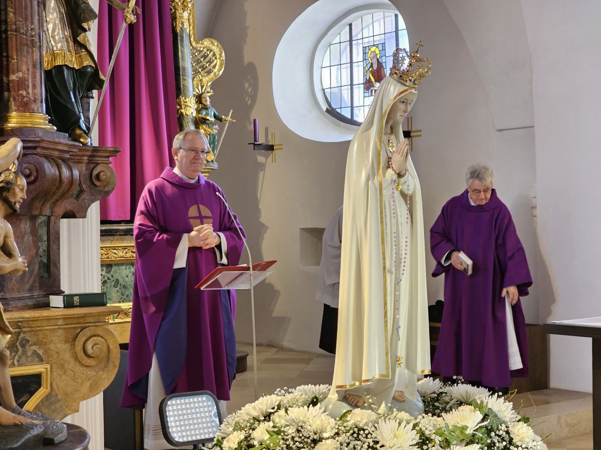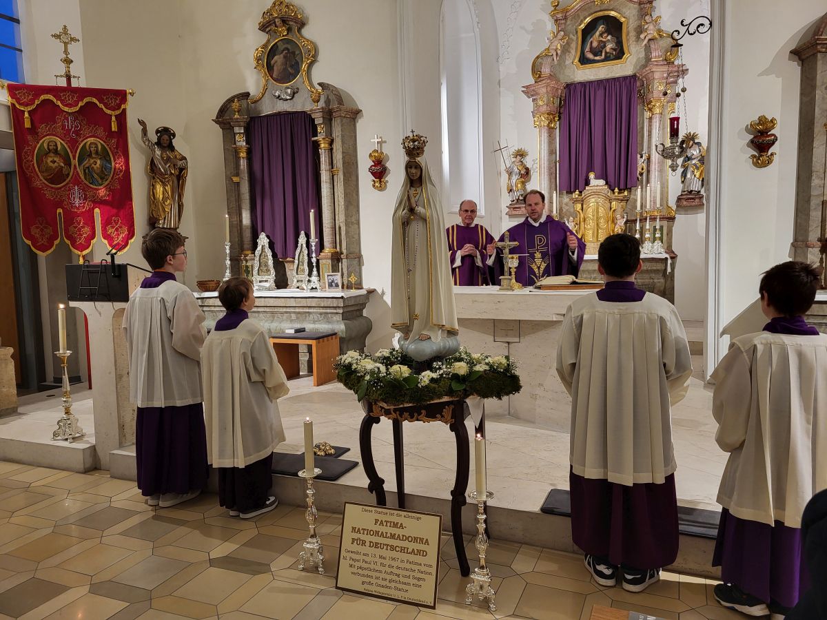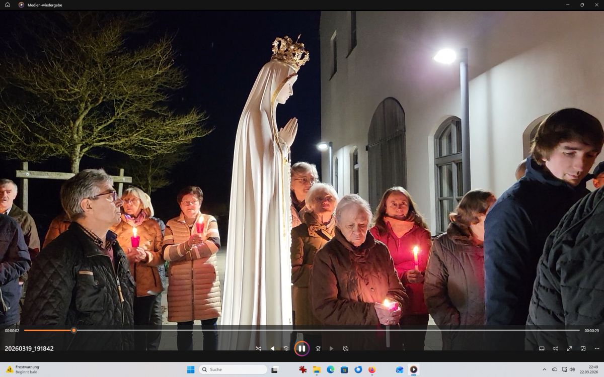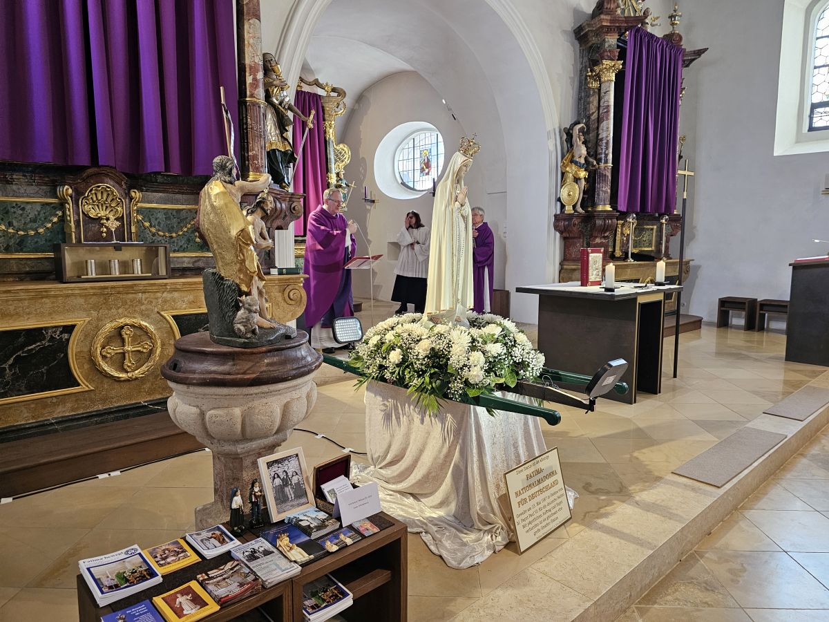 Mais. Symbolisch betrachtet durchbrach der helle Schein, der von der Fatima-Nationalmadonna ausgeht, bei der Lichterprozession in Mais die Dunkelheit und brachte die Strahlkraft dieser Gnadenstatue zum Ausdruck. Am zweiten Tag des Besuchs der Fatima-Madonna feierten 100 Marienverehrer im Beisein von Ruhestandspfarrer Ambros Trummer, Pfarrer Augustinus und der Patres aus dem Neukirchner Franziskanerkloster zusammen mit Diakon Walter Karger eine beeindruckende Fatima-Andacht in der Kirche St. Josef. Der Vorsitzende des Fatima-Weltapostolats U.L.F. in Deutschland e.V. erklärt die Bedeutung und den Ursprung der Fatima-Nationalmadonna, die für Deutschland geweiht und in Auftrag gegeben wurde, nicht fest in einer Kirche zu verbleiben, sondern durch die Lande zu ziehen. Zum Abschluss ihrer zweitägigen Stationsreise in Mais betete die große Schar der Gläubigen in Gegenwart der Fatima-Madonna in der St.-Josef-Kirche um den Frieden in der Welt. Diakon Karger, der dafür verantwortlich zeichnet, dass die Botschaft von Fatima unter die Leute kommt, führte bei der Lichterprozession das Reliquiar mit kleinsten Fragmenten der Seherkinder Jacinta und Francisco mit, und erteilte am Schluss nochmals den Einzelsegen. Im Mittelpunkt der beeindruckenden Gebetszeit stand die Besinnung auf „Unsere Liebe Frau von Fatima“. Resi Prechtl fungierte als Vorbeterin des gemeinsamen Fatima-Rosenkranzgebets mit den jeweiligen Meditationstexten „… Jesus, bei dessen Geburt Engel den Frieden verkündeten“ , „… der unsere Schritte auf den Weg des Friedens lenkt“, „… der seliggepriesen hat, die Frieden stiften“, „… der seine Jünger gesandt hat, den Frieden zu bringen“ und „…der uns seinen Frieden hinterlassen hat“. Zwischen den einzelnen Rosenkranz-Geheimnissen erschallte der Liedruf des „Kleinen Lobpreises“. Einen meditativen Impuls setzten die zehn Strophen des bekanntesten Fatima-Liedes „Ave Maria von Fatima“ (auch „Am dreizehnten Maien“), das die wundersamen Marienerscheinungen vom 13. Mai 1917 besingt. Der Liedtext beschreibt die Erscheinung der Jungfrau Maria vor den drei Hirtenkindern im Tal von Cova da Iria, mahnt zur Umkehr, zum Rosenkranzgebet und zur Verehrung Mariens mit dem melodischen Refrain: Ave, Ave, Ave Maria. Rosa Vogl fügte dem „Gebet an Unsere Liebe Frau von Fatima“ ihre eigenen Gedanken an, in denen sie Zuversicht in schweren Zeiten sowie die Fürbitte an Maria, die Königin des Friedens, äußerte. Unter der Leitung von Thomas Schmatz umrahmten die Neukirchner Sänger die Fatima-Andacht mit herzergreifenden Marienliedern, und verknüpften die Verehrung der Gottesmutter mit dem Lied „Da knie ich Maria vor deinem Bild“. Zusammen sprachen alle Andachtsbesucher das Gebet für den Frieden, während das Sängerquartett mit „Hör o Mutter dies Gebet, das aus treuem Herzen geht“ die Bitte verband: Maria verlass uns nicht! Im wohlklingenden Volksgesang wirkte das deutsche Volkslied „Leise sinkt der Abend nieder“ wie ein Gebet. Zu Herzen ging das von den Neukirchner Sängern im Kanon vorgetragene Lied „Wenn ich ein Glöcklein wär‘, schön wollt ich läuten“. So läuteten auch die Kirchenglocken von St. Josef als Zeichen für den Beginn der Lichterprozession. Nachdem alle Besucher ihre Kerzen gegenseitig entzündet hatten, nahmen sie Aufstellung zum feierlichen Umzug, bei dem sie betend das Maiser Gotteshaus weiträumig umrundeten. In Begleitung der Priester und Ordensleute trugen vier Ministranten die Gnadenstatue durch die Straßen. Die Fatima-Madonna, deren Strahlkraft im übertragenen Sinne die Dunkelheit erhellte, stand im Mittelpunkt der Lichterprozession, die der Verehrung und der Bitte um Frieden diente. Die charismatische Ausstrahlung der Fatima-Nationalmadonna begeisterte und inspirierte die Menschen, die sie bewunderten. Diese Statue zeichnet sich durch eine Kombination aus künstlerischer Ausdruckskraft und symbolischer Tiefe aus, die über eine rein handwerkliche Darstellung hinausgeht. Sie umgibt eine fesselnde Aura im positiven Sinn, weshalb die Menschen ihr folgen – so wie dieser Tage. Nach der Lichterprozession kehrte die Pilgermadonna in den Kirchenraum zurück, den das kirchliche Lied „Großer Gott“ im Volksgesang erfüllte. Ruhestandspfarrer Ambros Trummer dankte im Namen von Pfarrer Augustinus allen Organisatoren und Besuchern. Er fasste seine abschließenden Gedanken in Worte: Wir sind zu Maria gegangen, wir sind bei Maria gewesen und haben Geborgenheit gespürt, wir haben unsere Sorgen und Nöte ins Gebet hineingelegt, wir sind mit Maria hinausgezogen. Unterwegs symbolhaft, dass Maria alle unsere Wege mitgeht. Wir gehen nun von Maria weg – gestärkt und voller Zuversicht mit dem Segen Gottes unter der Fürsprache Mariens und der 14 Nothelfer, wie sie im Altarraum der Maiser Kirche zugegen sind. Am Ende spendete Diakon Walter Karger mit dem Reliquiar den Einzelsegen: „Auf die Fürsprache der Heiligen Seherkinder segne dich der allmächtige Gott…“. Ulrike Karger bot den Andachtsbesuchern an, sich aus der „Schatzkiste mit diversen Fatima-Sprüchen“ ein Exemplar mit nach Hause zu nehmen. Damit sollen die Gläubigen an diese besondere Begegnung mit der Fatima-Nationalmadonna für Deutschland immer wieder erinnert werden.