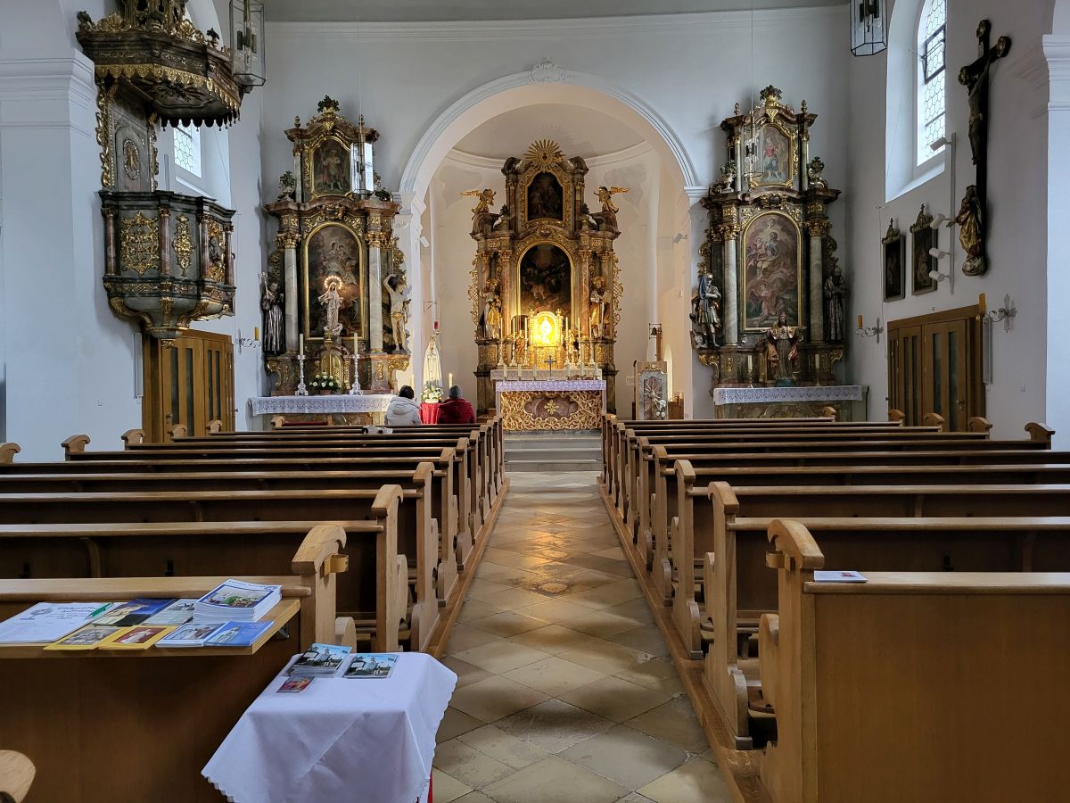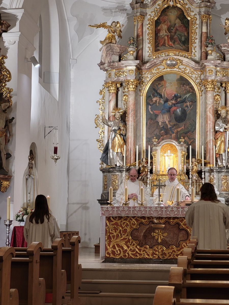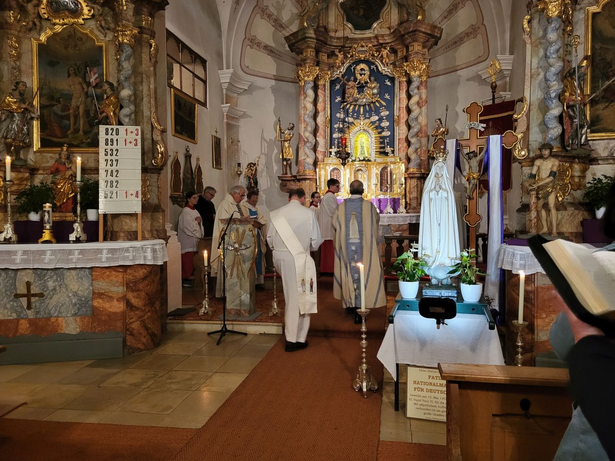 Mit Beginn des feierlichen Rosenkranzes um 18:15 Uhr zogunser Pfarrer Thomas Kohlhepp mit den Ministranten und der wunderschön mit weißen Rosen geschmückten Fatima-Nationalmadonna, getragen von vier Mitgliedern der Kolpingsfamilie, in die Pfarrkirche ein. Musikalisch wurde die Feier von der 11 er-Schola gestaltet, die die Wallfahrten seit Beginn begleitet. Zum Einzug erklang ein feierliches „Ave Maria" mit der neuen lauretanischen Litanei. Um 19.00 Uhr folgte die Wallfahrtsmesse unter dem Leitwort „Maria, Heil der Kranken". Mit festlichem Orgel- und Trompetenklang sowie dem Neunkirchener Mariengruß, der Text verfasst von unserem Pfarrer, wurde unser Maria Hilf Bild würdevoll geehrt.