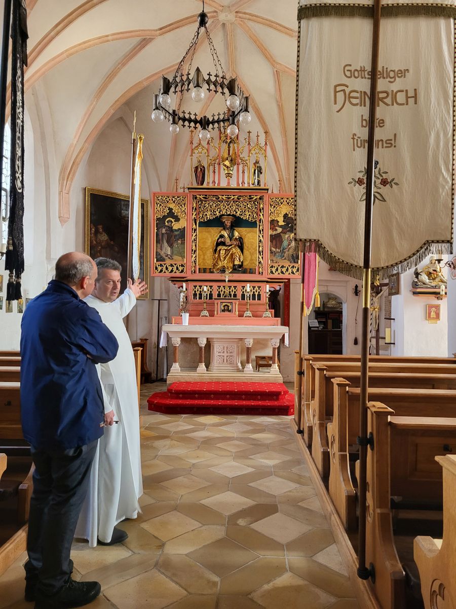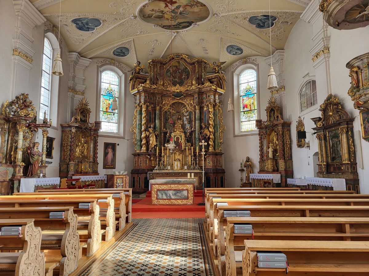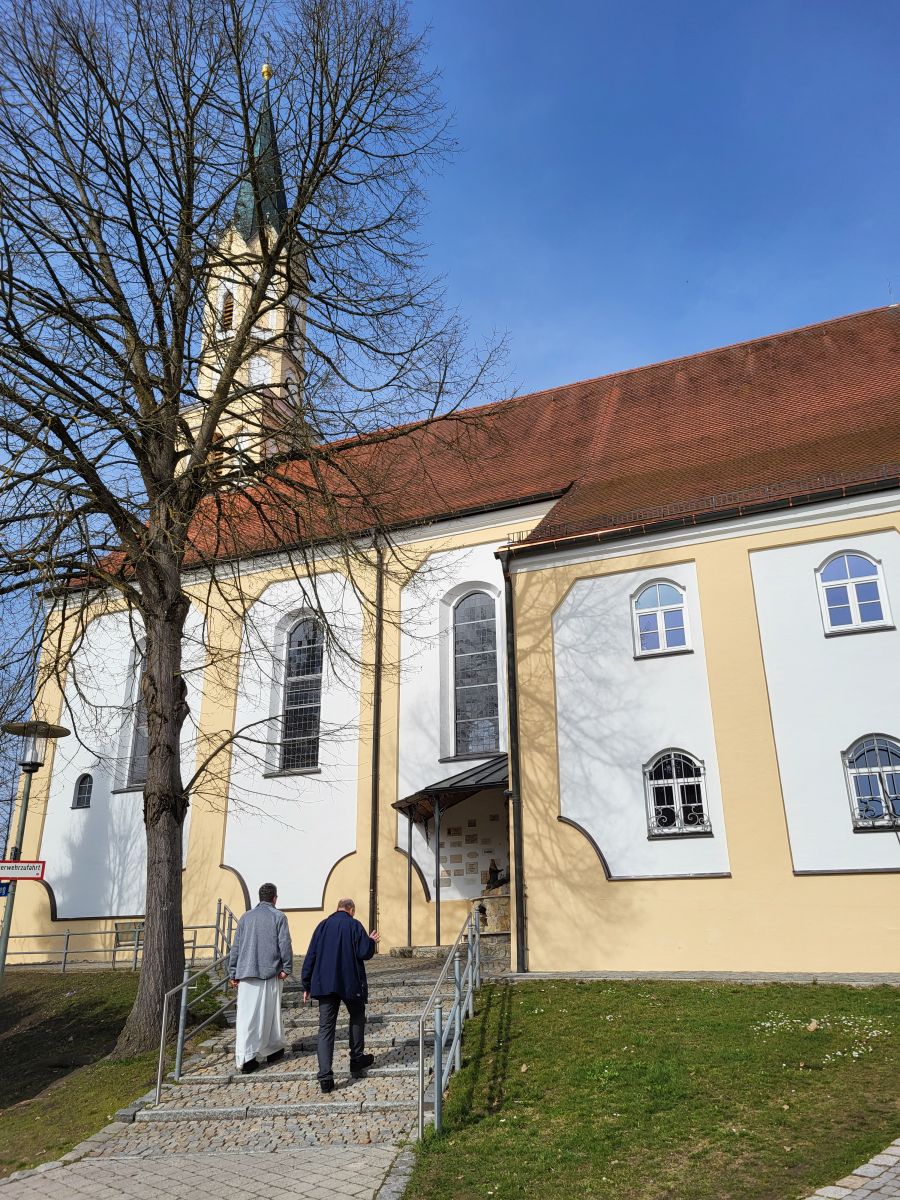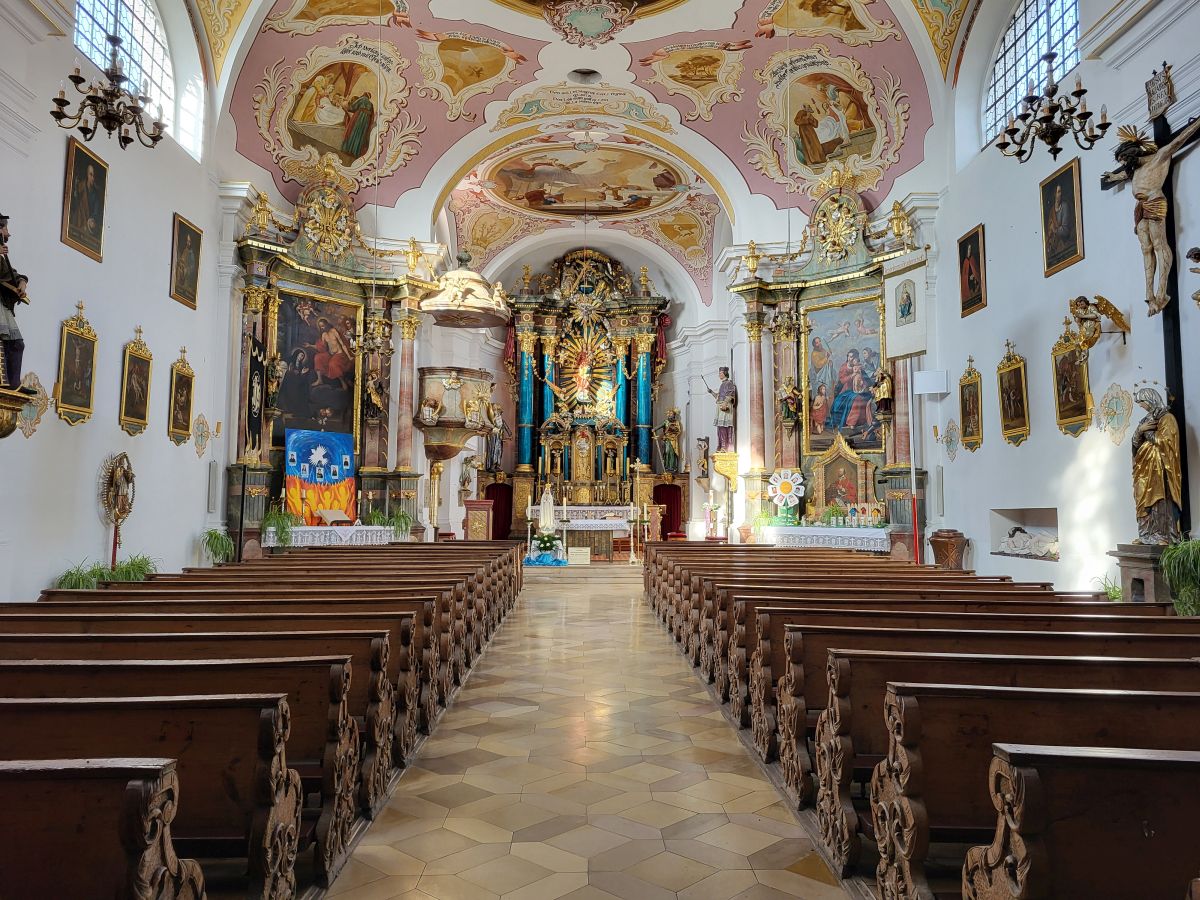 Mit Beginn des feierlichen Rosenkranzes um 18:15 Uhr zogunser Pfarrer Thomas Kohlhepp mit den Ministranten und der wunderschön mit weißen Rosen geschmückten Fatima-Nationalmadonna, getragen von vier Mitgliedern der Kolpingsfamilie, in die Pfarrkirche ein. Musikalisch wurde die Feier von der 11 er-Schola gestaltet, die die Wallfahrten seit Beginn begleitet. Zum Einzug erklang ein feierliches „Ave Maria" mit der neuen lauretanischen Litanei. Um 19.00 Uhr folgte die Wallfahrtsmesse unter dem Leitwort „Maria, Heil der Kranken". Mit festlichem Orgel- und Trompetenklang sowie dem Neunkirchener Mariengruß, der Text verfasst von unserem Pfarrer, wurde unser Maria Hilf Bild würdevoll geehrt.