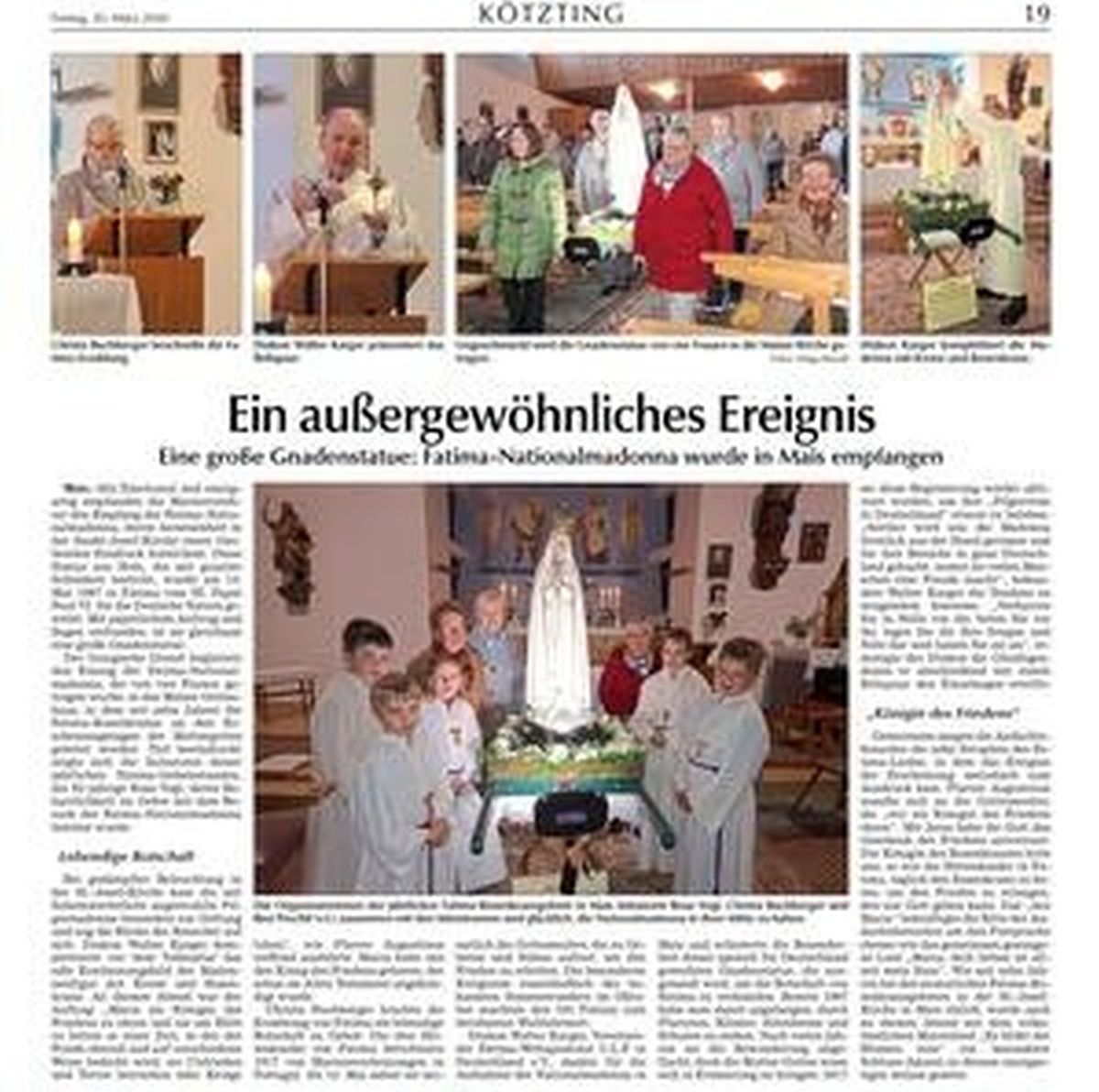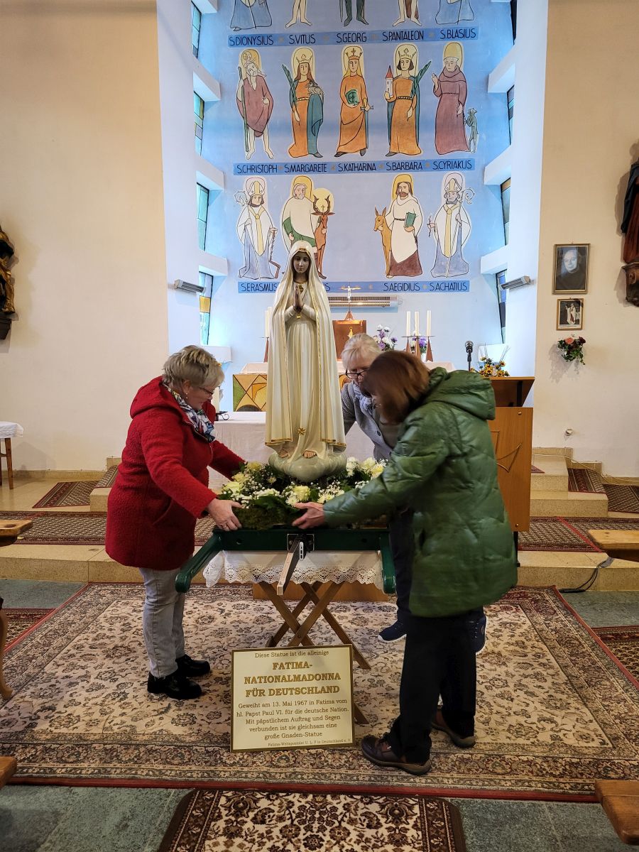 Mais. Emotional und einzigartig empfanden die Marienverehrer den Empfang der Fatima-Nationalmadonna, deren Anwesenheit in der Sankt-Josef-Kirche einen bleibenden Eindruck hinterlässt. Diese Statue aus Holz, die mit graziler Schönheit besticht, wurde am 13. Mai 1967 in Fatima vom Hl. Papst Paul VI. für die Deutsche Nation geweiht. Mit päpstlichem Auftrag und Segen verbunden, ist sie gleichsam eine große Gnadenstatue. Der liturgische Dienst begleitete den Einzug der Fatima-Nationalmadonna - die von vier Frauen getragen wurde - in das Maiser Gotteshaus, in dem seit zehn Jahren die Fatima-Rosenkränze an den Erscheinungstagen der Muttergottes gebetet werden. Tief beeindruckt zeigte sich die Initiatorin dieser jährlichen Fatima-Gebetsstunden, die 92-jährige Rosa Vogl, deren Beharrlichkeit im Gebet mit dem Besuch der Fatima-Nationalmadonna belohnt wurde. Bei gedämpfter Beleuchtung in der St.-Josef-Kirche kam die mit Scheinwerferlicht angestrahlte Pilgermadonna besonders zur Geltung und zog die Blicke der Besucher auf sich. Diakon Walter Karger komplettierte vor dem Volksaltar das edle Erscheinungsbild der Madonnenfigur mit Krone und Rosenkranz. An diesem Abend war der Auftrag „Maria als Königin des Friedens zu ehren und sie um Hilfe zu bitten in einer Zeit, in der der Friede überall und auf verschiedene Weise bedroht wird, wo Unfrieden und Terror herrschen oder Kriege toben“, wie Pfarrer Augustinus treffend ausführte. Maria hat uns den König des Friedens geboren, der schon im Alten Testament angekündigt wurde. Schon Jesaja berichtete vom wunderbaren Ratgeber und einem Fürst des Friedens. Wenn Jesus sagt „Frieden hinterlasse ich euch, meinen Frieden geb‘ ich euch“ dann meint er damit nicht einen Frieden, wie die Welt ihn gibt. Christa Buchberger brachte die Erzählung von Fatima als lebendige Botschaft zu Gehör: Die drei Hirtenkinder von Fátima berichteten 1917 von Marienerscheinungen in Portugal. Ab 13. Mai sahen sie monatlich die Gottesmutter, die zu Gebeten und Sühne aufrief, um den Frieden zu erbitten. Die besonderen Ereignisse einschließlich des bekannten Sonnenwunders im Oktober, machten den Ort Fatima zum berühmten Wallfahrtsort. Diakon Walter Karger, Vorsitzender Fatima-Weltapostolat U.L.F. in Deutschland e.V., dankte für die Aufnahme der Nationalmadonna in Mais, und erläuterte die Besonderheit dieser speziell für Deutschland geweihten Gnadenstatue, die ausgesandt wird um die Botschaft von Fatima zu verkünden. Bereits 1967 hat man damit angefangen, durch Pfarreien, Klöster, Altenheime und Schulen zu ziehen. Nach vielen Jahren ist die Bewunderung abgeflacht, doch die Mutter Gottes weiß sich in Erinnerung zu bringen: 2017 wurde diese Begeisterung wieder aktiviert, um ihre „Pilgerreise in Deutschland“ erneut zu beleben. Seither wird uns die Madonna förmlich aus der Hand gerissen und für ihre ‚Besuche‘ in ganz Deutschland gebucht, womit sie vielen Menschen eine Freude macht, bekundete Walter Karger die Tendenz zu steigendem Interesse. „Verharren Sie in Stille vor ihr, beten Sie vor ihr, legen Sie ihr Ihre Sorgen und Nöte dar und fassen Sie sie an“ ermutigte der Diakon die Gläubigen, denen er abschließend mit einem Reliquiar den Einzelsegen erteilte. Gemeinsam sangen die Andachtsbesucher die zehn Strophen des Fatima-Liedes, in dem das Ereignis der Erscheinung melodisch zum Ausdruck kam. Pfarrer Augustinus wandte sich an die Gottesmutter, die wir als Königin des Friedens ehren. Mit Jesus hat ihr Gott das Geschenk des Friedens anvertraut. Die Königin des Rosenkranzes bittet uns, so wie die Hirtenkinder in Fatima, täglich den Rosenkranz zu beten, um den Frieden zu erlangen, den nur Gott geben kann. Das „Ave Maria“ mit dem Rosenkranzgesätz „…, der uns Friede ist…“ bekräftigte die Bitte der Andachtsbesucher um ihre Fürsprache ebenso wie das gemeinsam gesungene Lied „Maria, dich lieben ist allzeit mein Sinn“. Wie seit zehn Jahren bei den monatlichen Fatima-Rosenkranzgebeten in der St.-Josef-Kirche in Mais üblich, wird auch an diesem Abend mit dem volkstümlichen Marienlied „Es blüht der Blumen eine“ ein besonderer Schluss-Akzent zu diesem einzigartigen Anlass gesetzt.