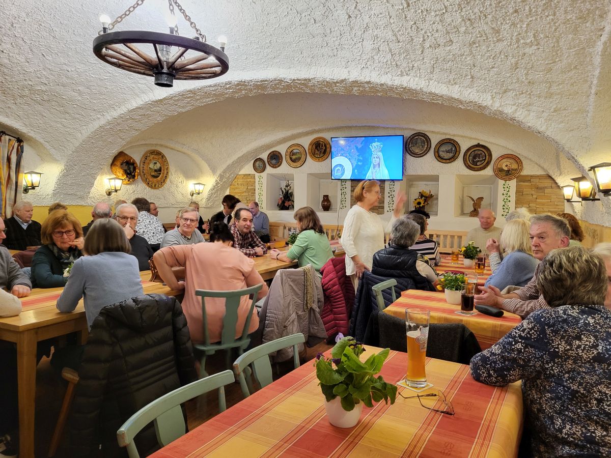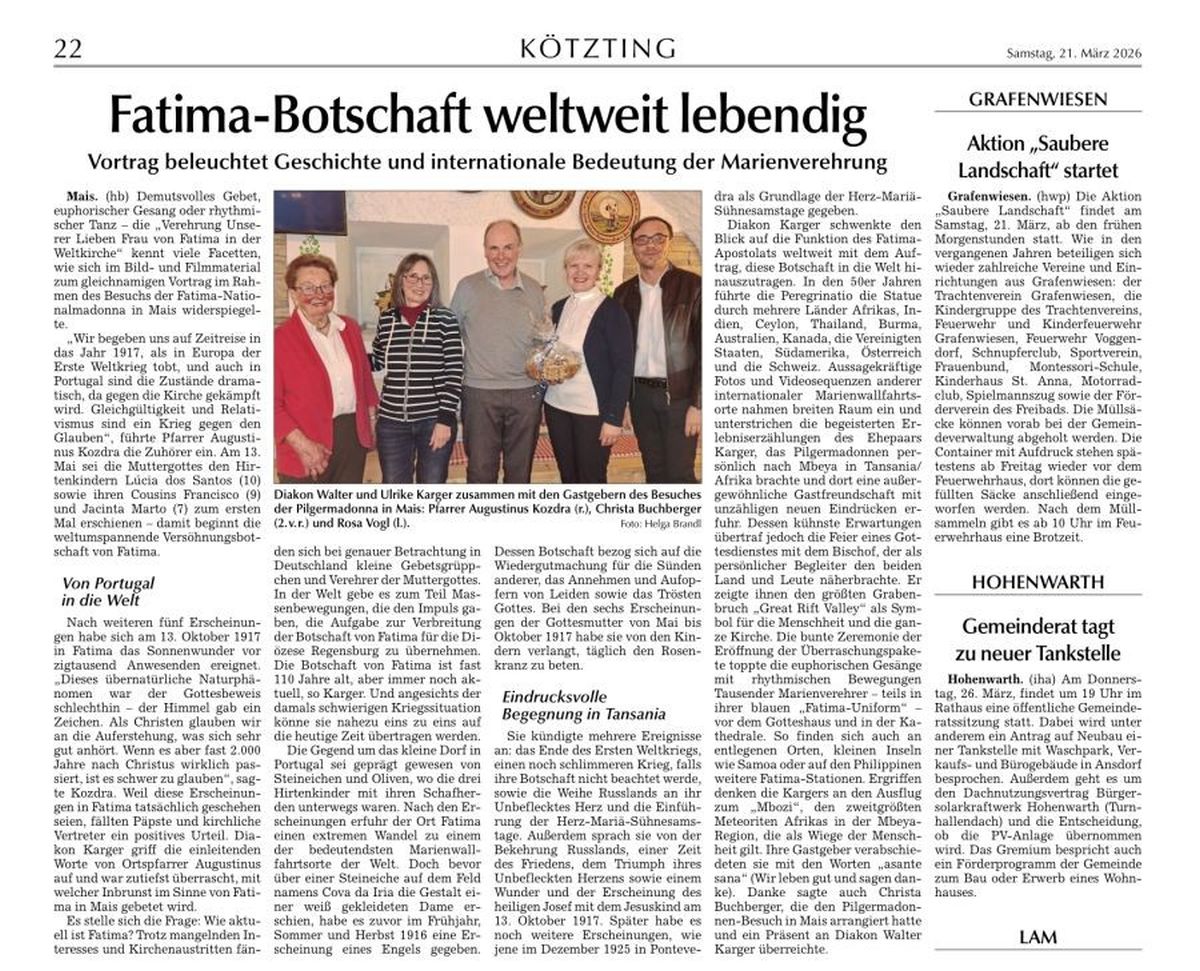 Mais. Demutsvolles Gebet, euphorischer Gesang oder rhythmischer Tanz – die „Verehrung Unserer Lieben Frau von Fatima in der Weltkirche“ kennt viele Facetten, wie sich im Bild- und Filmmaterial zum gleichnamigen Vortrag im Rahmen des Besuchs der Fatima-Nationalmadonna in Mais widerspiegelte. Im Gasthof „zum Klement“ begrüßte Pfarrer Dr. Augustinus Kozdra neben zahlreichen Zuhörern den Referenten, Diakon Walter Karger, der zusammen mit seiner Ehefrau Ulrike schon viele Stationen bereiste, um die Versöhnungsbotschaft von Fatima mitzuerleben und als 1. Vorsitzender des Fatima-Weltapostolats U.L.F. in Deutschland e.V. zu intensivieren und weiterzugeben. „Wir begeben uns auf Zeitreise in das Jahr 1917, als in Europa der 1. Weltkrieg tobt, und auch in Portugal sind die Zustände dramatisch, da gegen die Kirche gekämpft wird. Gleichgültigkeit und Relativismus ist ein Krieg gegen den Glauben“ gab der Priester zu bedenken. Am 13. Mai erscheint die Muttergottes den Hirtenkindern Lúcia dos Santos (10) sowie ihren Cousins Francisco (9) und Jacinta Marto (7) zum ersten Mal – damit beginnt die weltumspannende Versöhnungsbotschaft von Fatima. Nach weiteren fünf Erscheinungen geschah am 13. Oktober 1917 in Fatima das Sonnenwunder vor zigtausend Anwesenden. Dieses übernatürliche Naturphänomen war der Gottesbeweis schlechthin - der Himmel gab ein Zeichen. Als Christen glauben wir an die Auferstehung, was sich sehr gut anhört. Wenn es aber fast 2000 Jahre nach Christus wirklich passiert, ist es schwer zu glauben. Da diese Erscheinungen in Fatima tatsächlich geschehen sind, fällten Päpste und kirchliche Vertreter ein positives Urteil. Diakon Karger griff die einleitenden Worte von Ortspfarrer Augustinus auf und war zutiefst überrascht, mit welcher Inbrunst im Sinne von Fatima in Mais gebetet wird. Mit einer derart großen Gruppe von über 50 Menschen ist die Welt hier noch völlig in Ordnung. Es stellt sich die Frage: Wie aktuell ist Fatima? Trotz mangelndem Interesses und Kirchenaustritten finden sich bei genauer Betrachtung in Deutschland kleine Gebetsgrüppchen und Fangruppen der Muttergottes. In der Welt gibt es zum Teil Massenbewegungen, die uns den Push gaben, die Aufgabe zur Verbreitung der Botschaft von Fatima für die Diözese Regensburg zu übernehmen. Die Botschaft von Fatima ist fast 110 Jahre alt, aber immer noch aktuell! Und angesichts der damals schwierigen Kriegssituation kann sie nahezu 1:1 auf die heutige Zeit übertragen werden. Unterwegs für den Frieden als Pilger der Hoffnung stieg Diakon Walter Karger in die Bilderpräsentation ein. Damit erfuhren die Besucher im Vortrag Wissenswertes über die Geschichte der Erscheinungen von Fatima und deren weitere Entwicklung. Die Gegend um das kleine Dorf in Portugal war geprägt von Steineichen und Oliven, wo die drei Hirtenkinder mit ihren Schafherden unterwegs waren. Nach den Erscheinungen erfuhr der Ort Fatima einen extremen Wandel zu einem der bedeutendsten Marienwallfahrtsorten der Welt. Doch bevor über einer Steineiche auf dem Feld namens Cova da Iria Unsere Liebe Frau in Gestalt einer weiß gekleideten Dame erschien, gab es zuvor im Frühjahr, Sommer und Herbst 1916 eine Erscheinung des Engels von Portugal, der die Kinder gewissermaßen vorbereitet, ihnen das Gebet gelehrt und das Geheimnis der Eucharistie erklärt hatte. Die Botschaft des Engels bezog sich zudem auf die Wiedergutmachung für die Sünden anderer, das Annehmen und Aufopfern von Leiden, sowie das Trösten Gottes. Bei den sechs Erscheinungen der Gottesmutter von Mai bis Oktober 1917 wünschte sie von den Kindern täglich den Rosenkranz zu beten für den Frieden, Leiden ertragen und aufopfern für die Bekehrung der Sünder, Sühne leisten für die Beleidigungen Gottes und eine Kapelle zu bauen. Sie kündigte an: das Ende des Ersten Weltkriegs; einen weiteren schlimmeren Krieg, wenn man nicht auf ihre Worte hört; die Weihe Russlands an ihr Unbeflecktes Herz und die Einführung der Herz-Mariä-Sühnesamstage; die Bekehrung Russlands und eine Zeit des Friedens; den Triumph ihres Unbefleckten Herzens, sowie ein Wunder und die Erscheinung des Hl. Josef mit dem Jesuskind am 13. Oktober 1917. Sie offenbarte ein Geheimnis, das aus drei Teilen besteht: Sie stärkt den Glauben an die Echtheit der Botschaft durch das Sonnenwunder vor 70.000 Menschen. Sie lehrt Gebete wie den Rosenkranz und das Opfern eigener Leiden für die Sünder. Noch im Kindesalter hat Gott seinen „Trostengel“ Francisco und seinen Sühneengel“ Jacinta zu sich geholt. Lucia, das älteste der drei Seherkinder entschied sich für das Ordensleben. Später gab es noch weitere Erscheinungen, wie jene im Dezember 1925 in Pontevedra als Grundlage der Herz-Mariä-Sühnesamstage: Sr. Lucia hat kurz nach ihrer Ankunft im Kloster Erscheinungen des Jesuskindes und der Gottesmutter. Im Juni 1929 hat sie im Kloster in Tuy eine Vision der Heiligsten Dreifaltigkeit. Dabei erscheint auch Unsere Liebe Frau von Fatima mit ihrem Unbefleckten Herzen in der Hand. Sie war es auch, die am 13. Februar 2005 kam, um Sr. Lucia heimzuholen. Lucias sterblicher Leib ruht, neben dem ihrer beiden Gefährten, in der Basilika von Fatima. Diakon Karger schwenkte den Blick auf die Funktion des Fatima-Apostolats weltweit mit dem Auftrag diese Botschaft in die Welt hinauszutragen. In den 50er Jahren führte die Peregrinatio die Statue durch mehrere Länder Afrikas, Indien, Ceylon, Thailand, Burma, Australien, Kanada, die Vereinigten Staaten, Südamerika, Österreich und die Schweiz. Aussagekräftige Fotos und Videosequenzen anderer internationaler Marienwallfahrtsorte nahmen breiten Raum ein und unterstrichen die begeisterten Erlebniserzählungen des Ehepaars Karger, das Pilgermadonnen persönlich nach Mbeya in Tansania/Afrika brachte und dort eine außergewöhnliche Gastfreundschaft mit unzähligen neuen Eindrücken erfuhr. Ihre kühnsten Erwartungen übertraf jedoch die Feier eines bewegten Gottesdienstes mit dem 